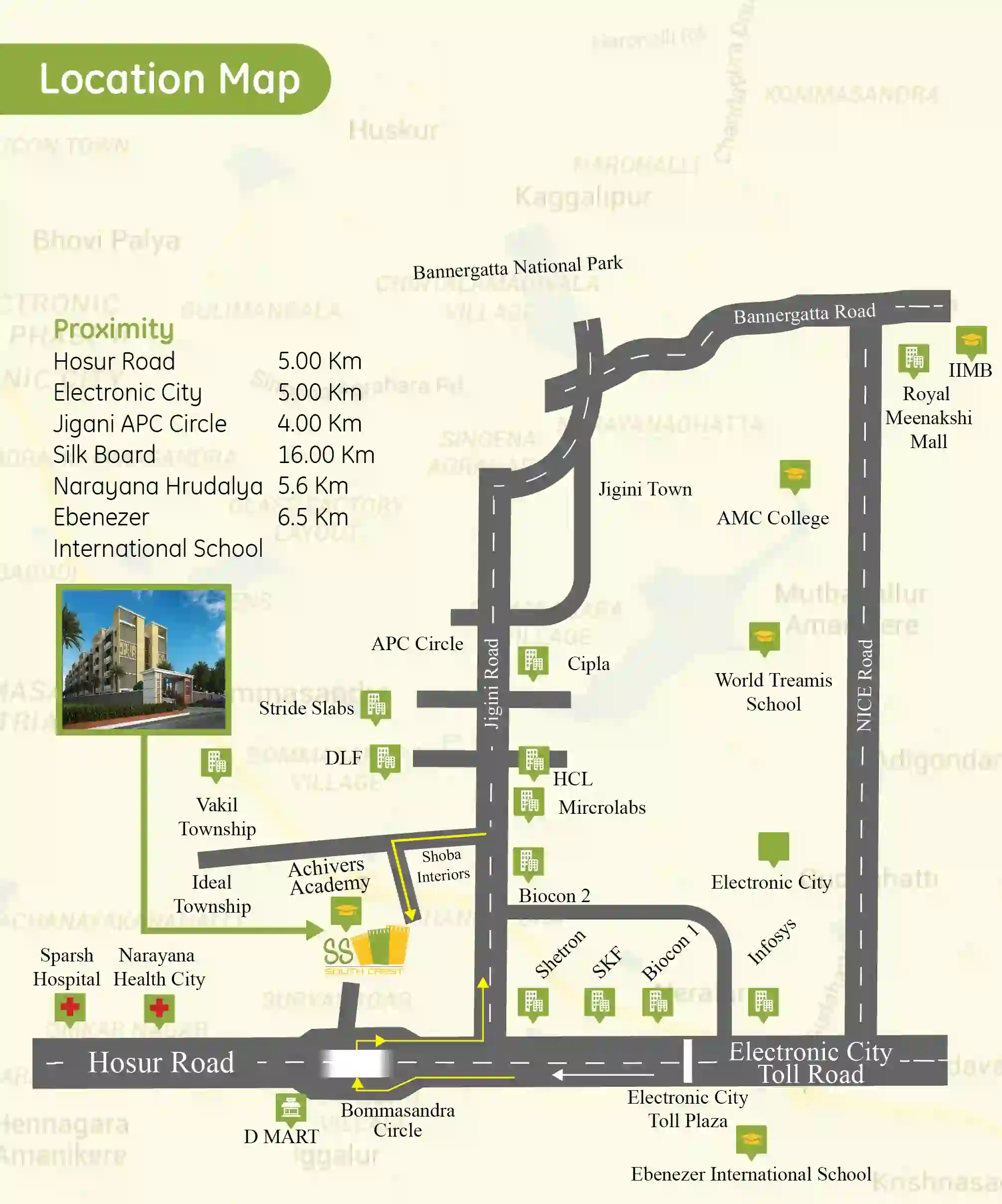SS South Crest is a serene residential project situated at Bommasandra, Bangalore. The project offers spacious environments with tons of natural light and ventilation. The interiors have been designed with prominence given to the project's architecture. You will find a good number of educational institutions, hospitals, tech parks, lakes, and more within short distances. SS South Crest provides you a divine experience of luxury. Check out other projects by MSR Shelters offering luxury living in Bangalore, including Poorvi Champions Heights, Poorvi Enchanting & MSR Passion Square.